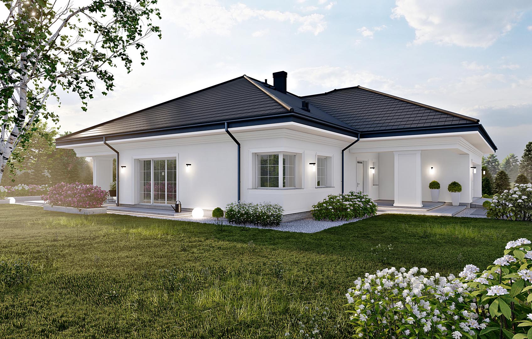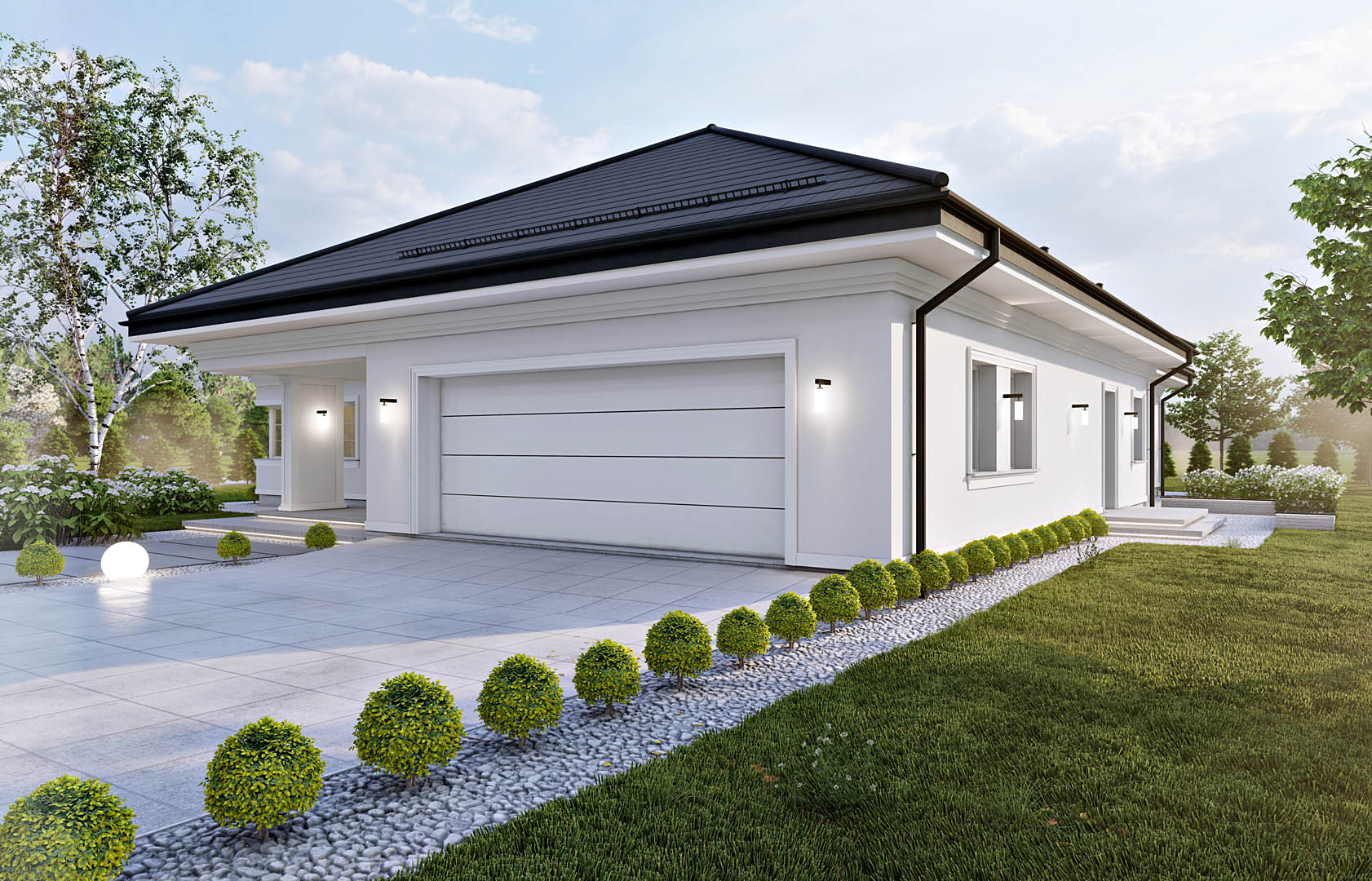 Finalnie powstał klasyczny parterowy dom jednorodzinny z garażem dwustanowiskowym wkomponowanym w bryłę budynku. Budynek został zaprojektowany z dachem wielospadowym pokrytym płaską dachówką ceramiczną.
