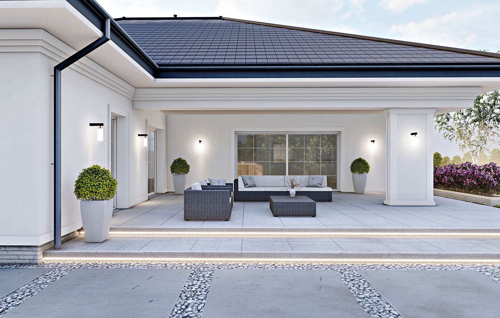 Dom został zaprojektowany z myślą o komforcie użytkowania. Taras częściowo zadaszony zapewnia możliwość korzystania z niego niezależnie od warunków pogodowych.