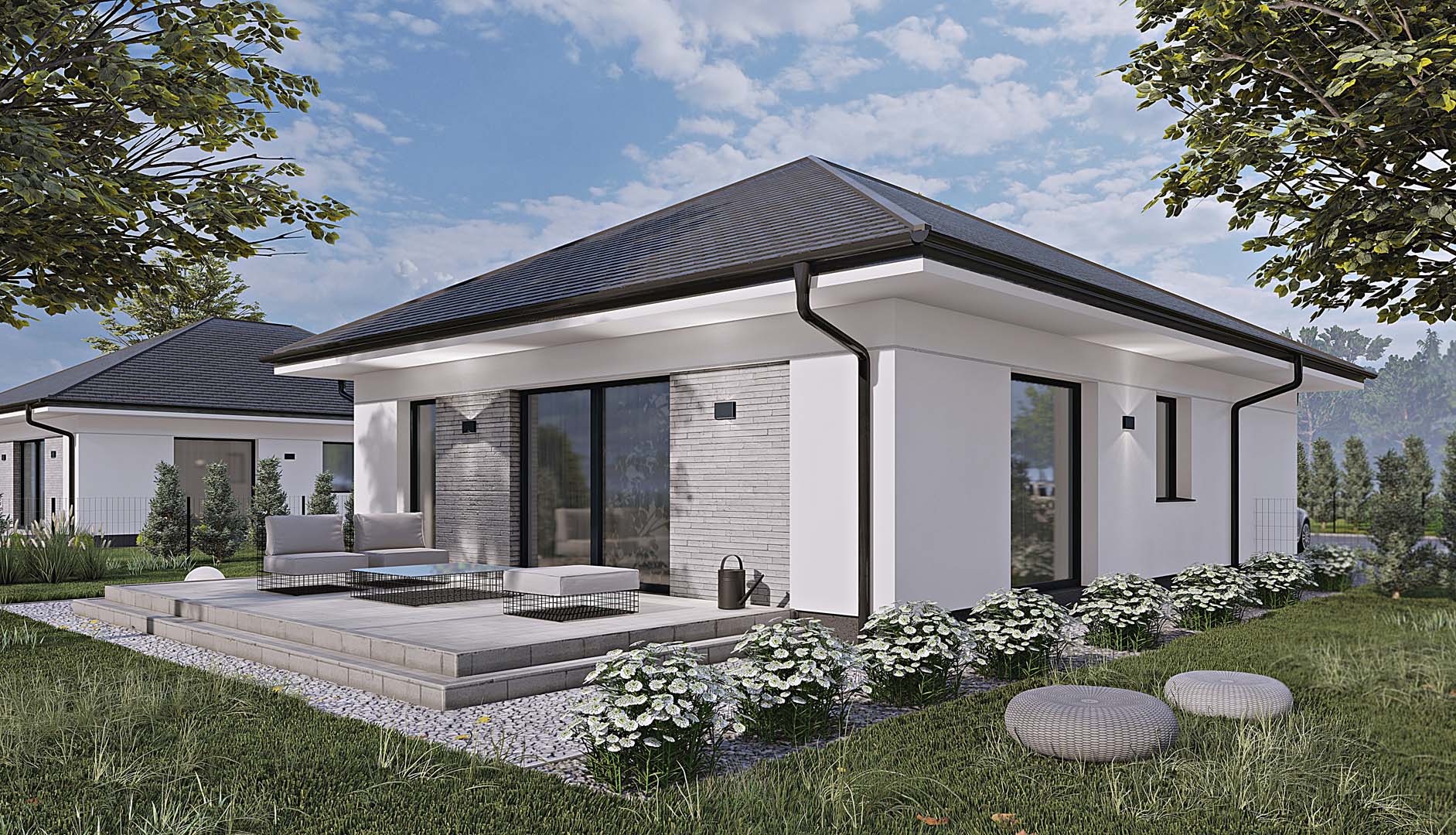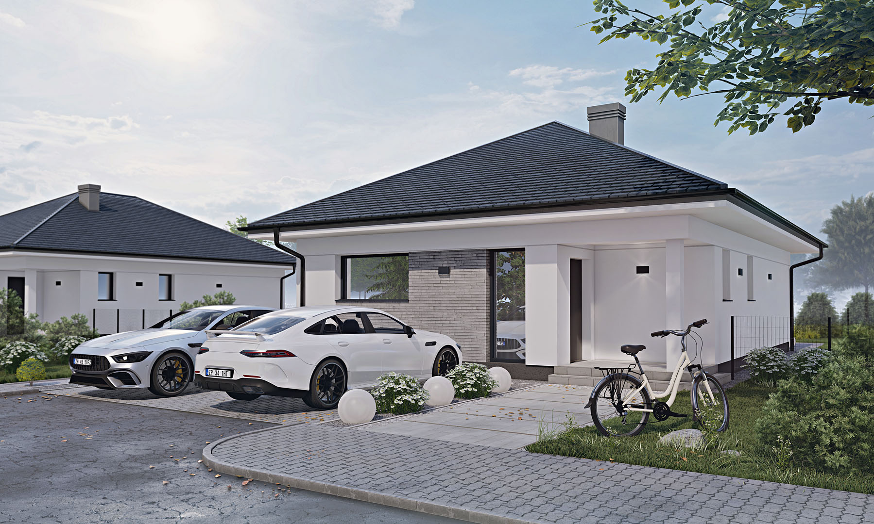 Elewacja budynków została zaprojektowana w jasnym tynku, uzupełnionym o kontrastujące elementy, takie jak stolarka okienno-drzwiowa i dach. Dodatkowo, dla nadania całości elegancji, zastosowano okładzinę elewacyjną imitującą kamień, która podkreśla nowoczesny i estetyczny charakter domów.
