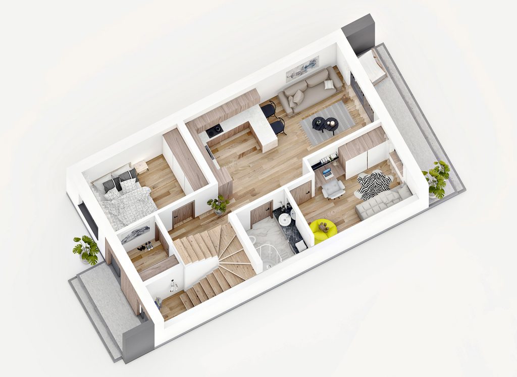 Uzupełnieniem wysokiej jakości oferty jest stworzenie planu 3D domu lub lokalu mieszkalnego. Wiemy, że surowa dokumentacja techniczna nie zawsze przemawia do wyobraźni, dlatego oferujemy coś więcej – atrakcyjne rzuty 3D, które w prosty i efektowny sposób przedstawiają układ pomieszczeń.